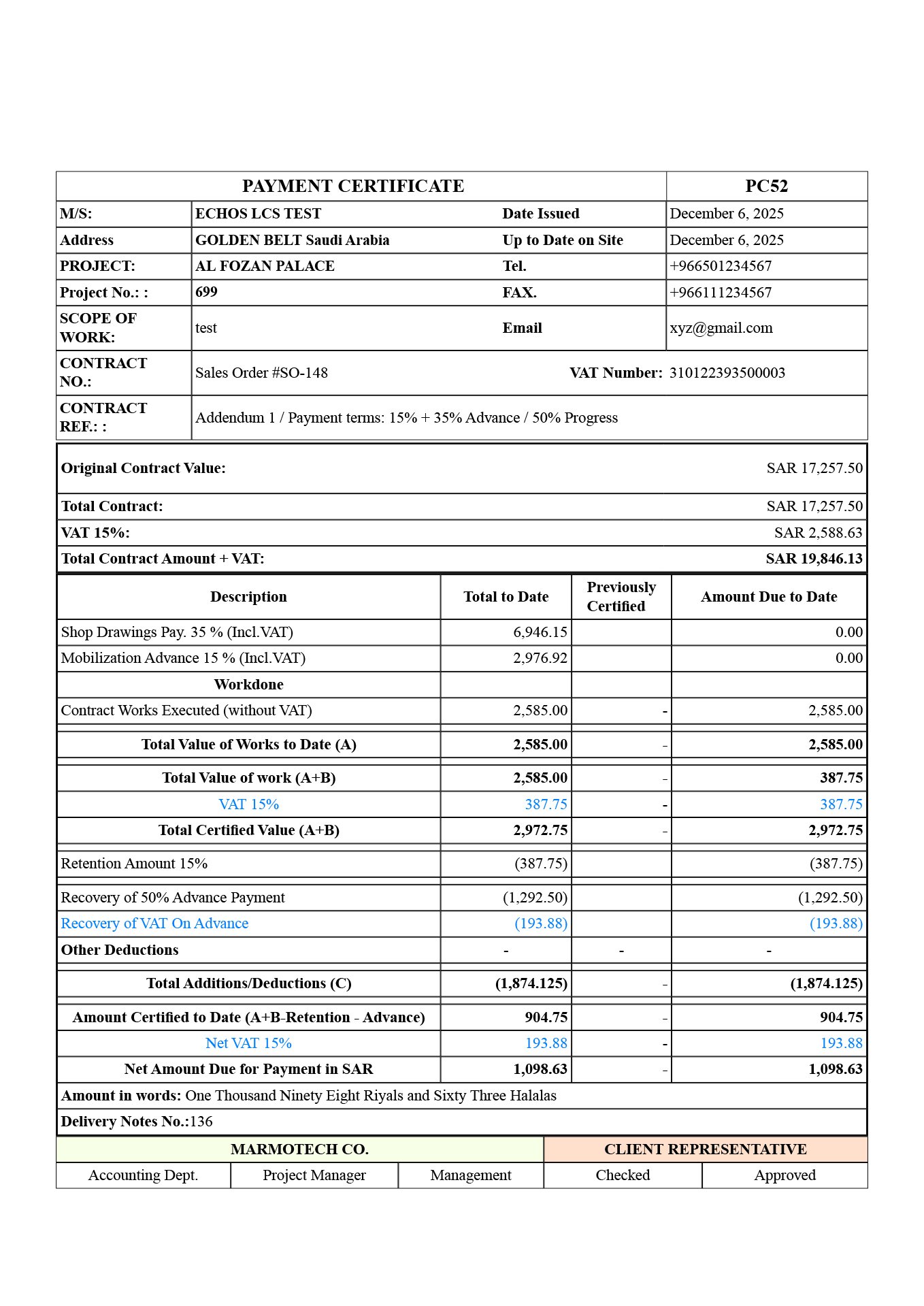 Payment Certificates, including VAT, progress %, and net