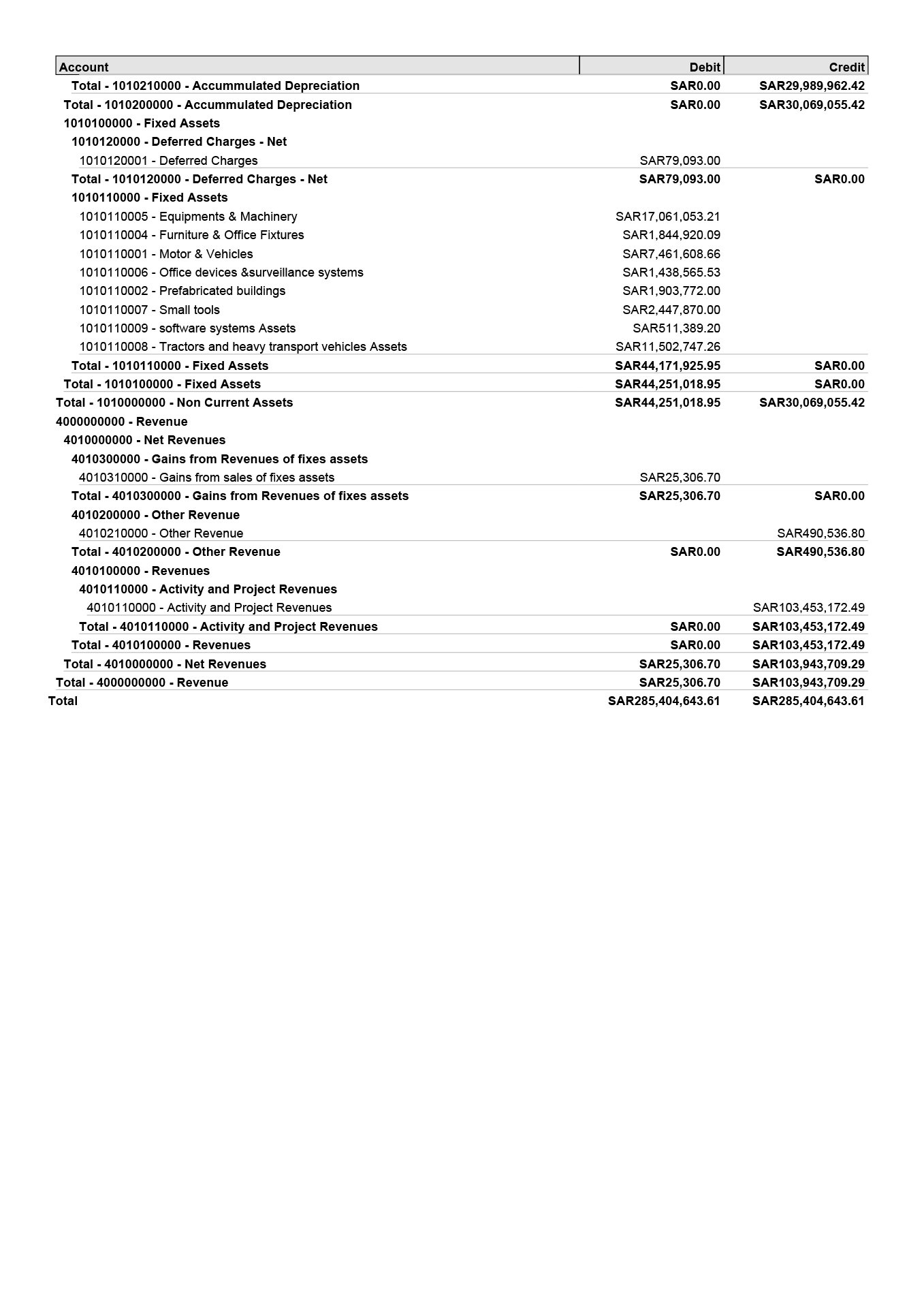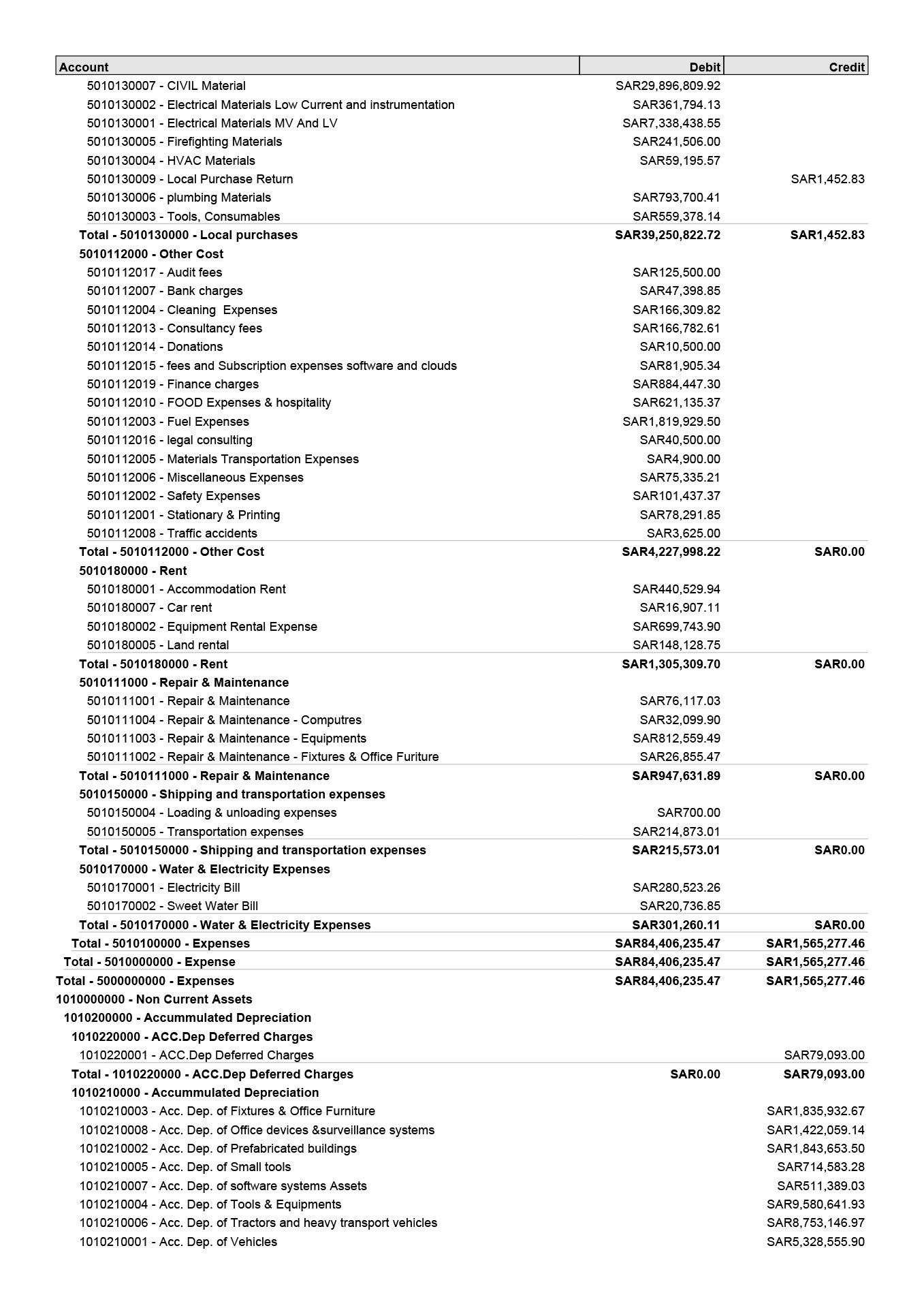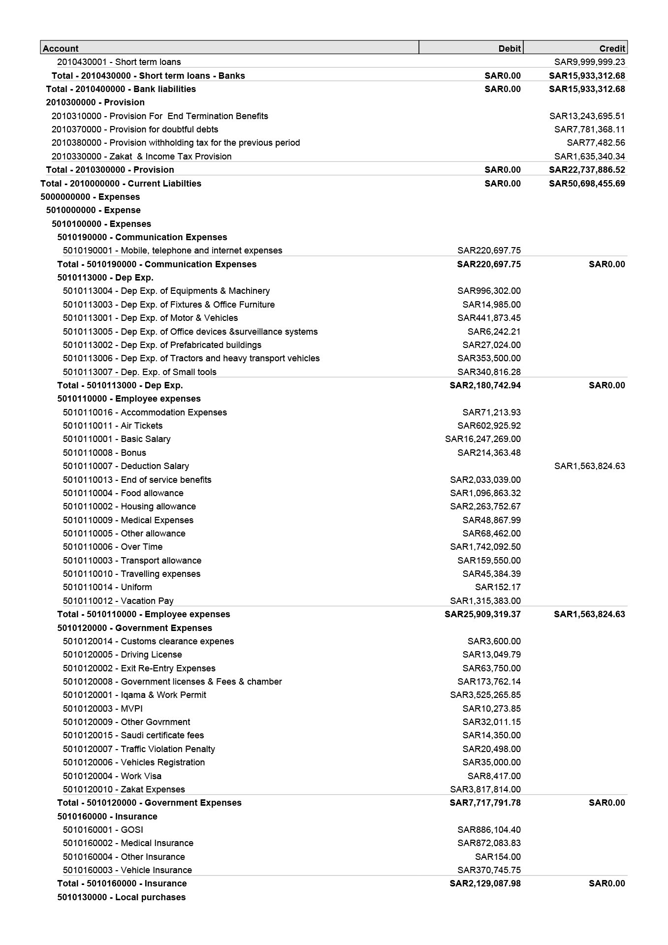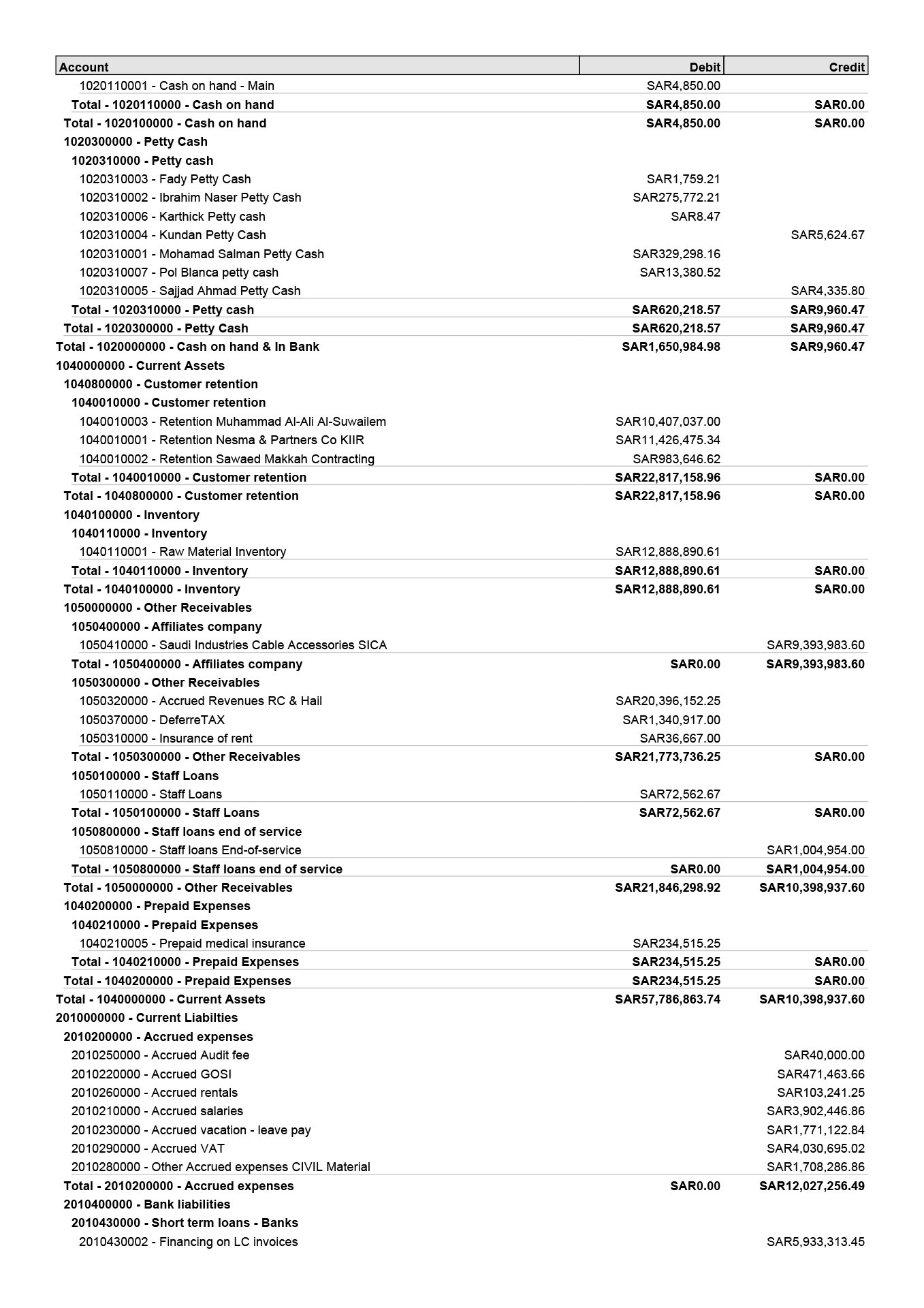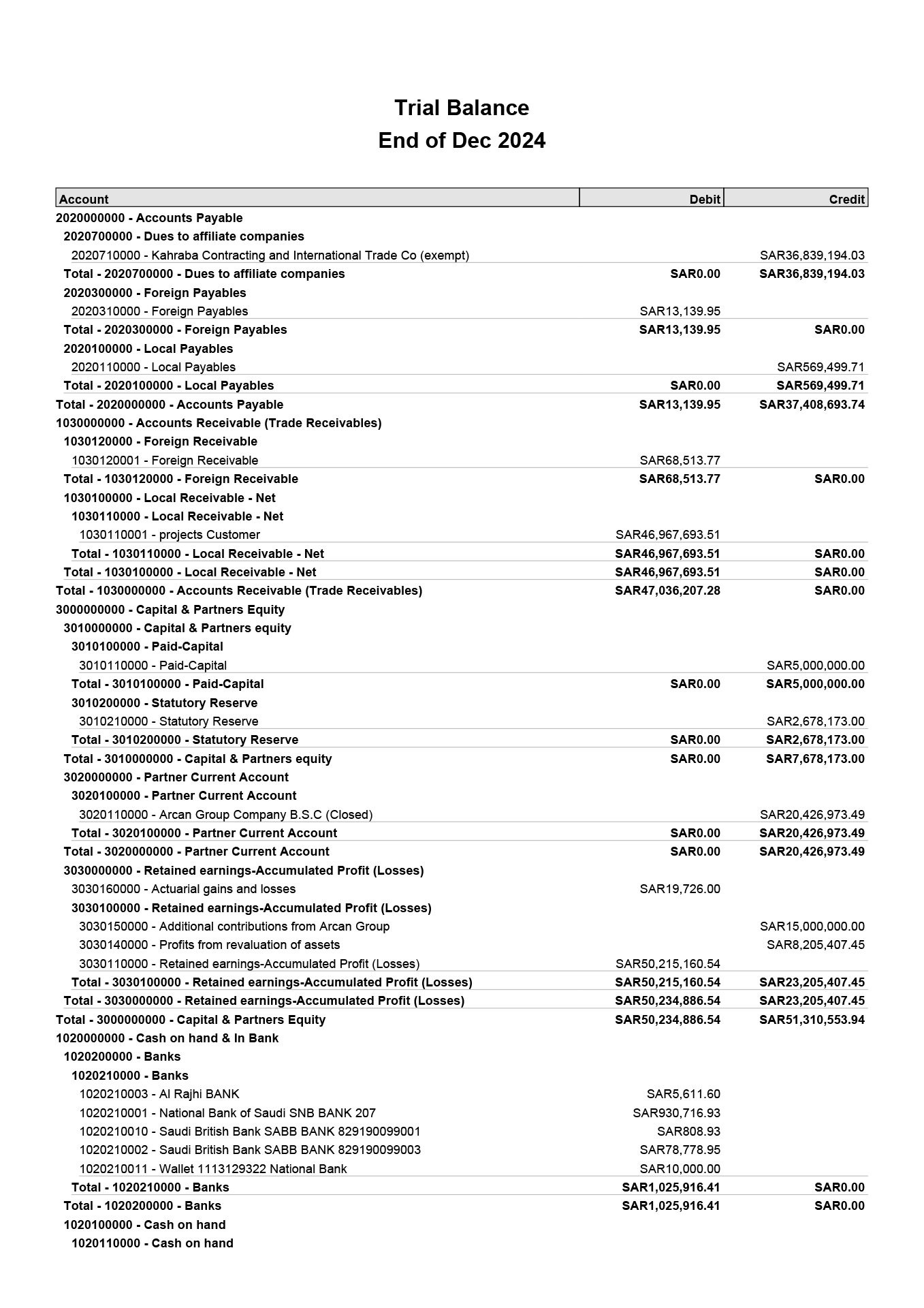 Trial Balance, showing payables, receivables, bank balances &